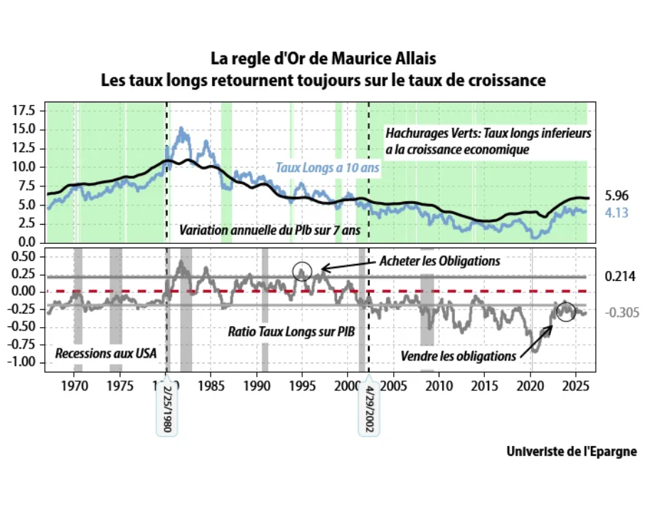 Le graphique est hachuré en vert quand les taux longs sont inférieurs aux taux de croissance de l’économie