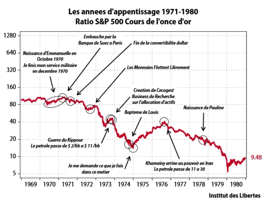 Les dix premières années de ma carrière furent … riches d’enseignements, le ratio entre l’indice S&P 500 et le cours de l’or passant début 1972 à …9,48 en décembre 1980 (-90 %). C’est ce que montre mon premier graphique, dans lequel je mélange vie personnelle et évènements historiques car ma chère épouse eut la merveilleuse idée de m’offrir trois beaux enfants pendant cette période.