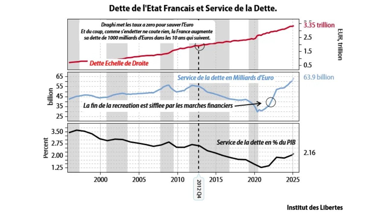 La ligne bleue c’est le service de la dette en milliards d’euro