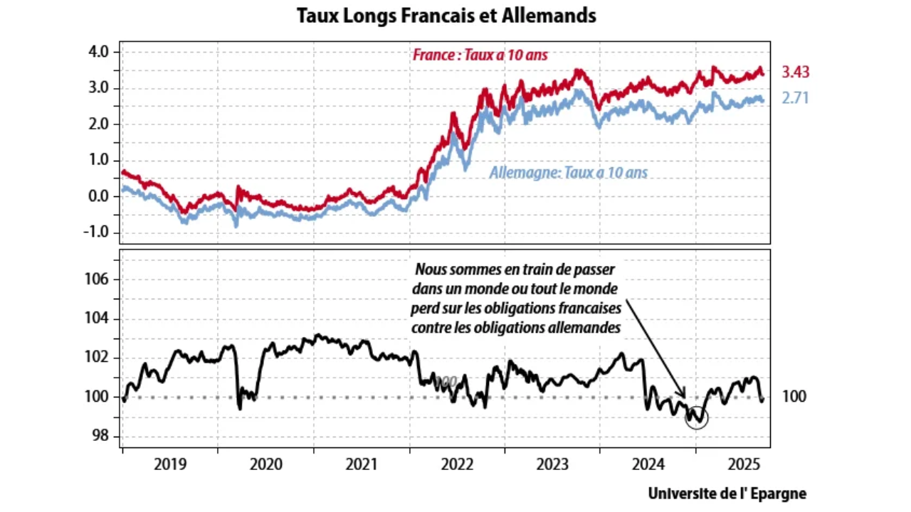 La duration moyenne de la dette en France est d’environ 8 ans, c’est-à-dire que la dette tourne en 8 ans. Sur les 5 premières années des 8 dernières années, le taux était proche de zéro %.