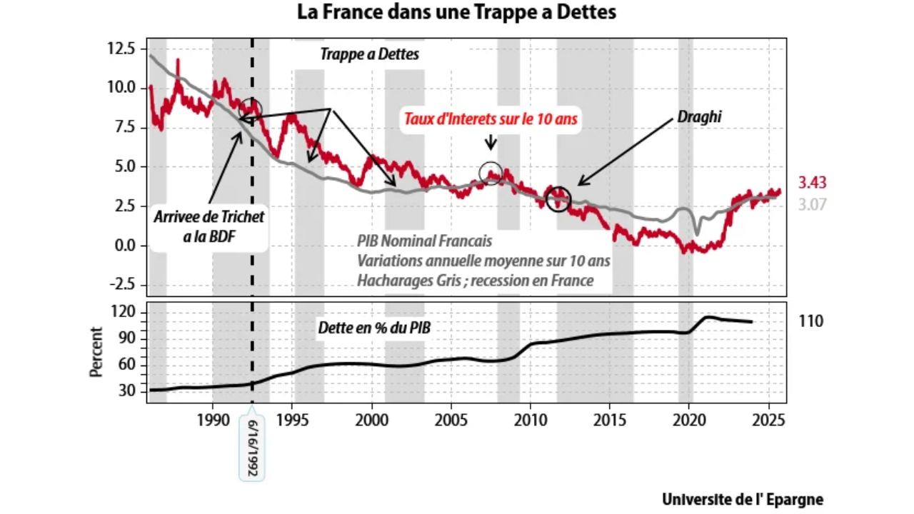 1. La ligne bleue c’est la croissance nominale du PIB Français sur les 7 années précédentes.